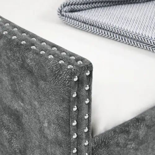 Full-size sofa-bed with double-sized upholstered tufted sofa-bed on wheels with buttons on the back and copper studs on wavy arms, grey (80.5"x55.5"x27.5")